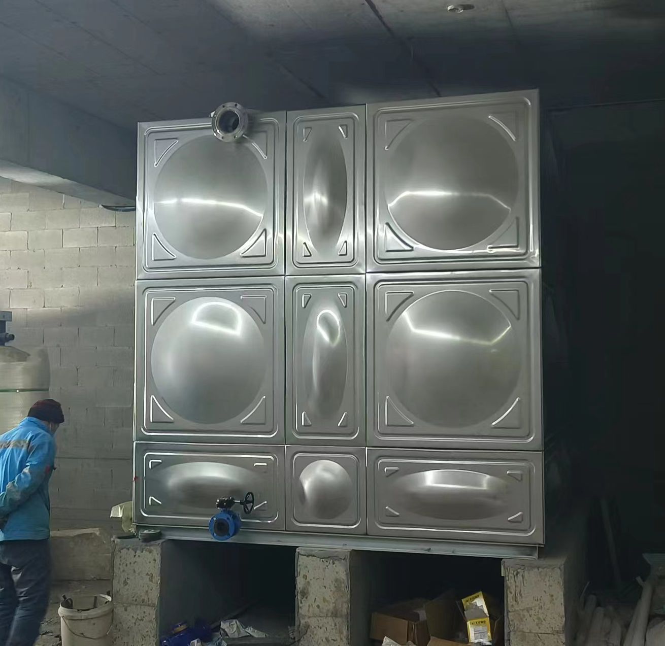我司承接的河北省唐山市玉田縣潤城府地下室不銹鋼生活水箱項目,已安裝試水完畢。不銹鋼焊接水箱,是指容器本體用不銹鋼板沖壓帶一定凹凸形狀,使之鋼度大大提高,再焊接成薄殼箱體的新型水箱,是目前國內較先進、較美觀、較適用的水箱,其結構精巧、合理、先進,用材省,可在民用及工業建筑中廣泛采用,是儲存、調節用水的理想設備。