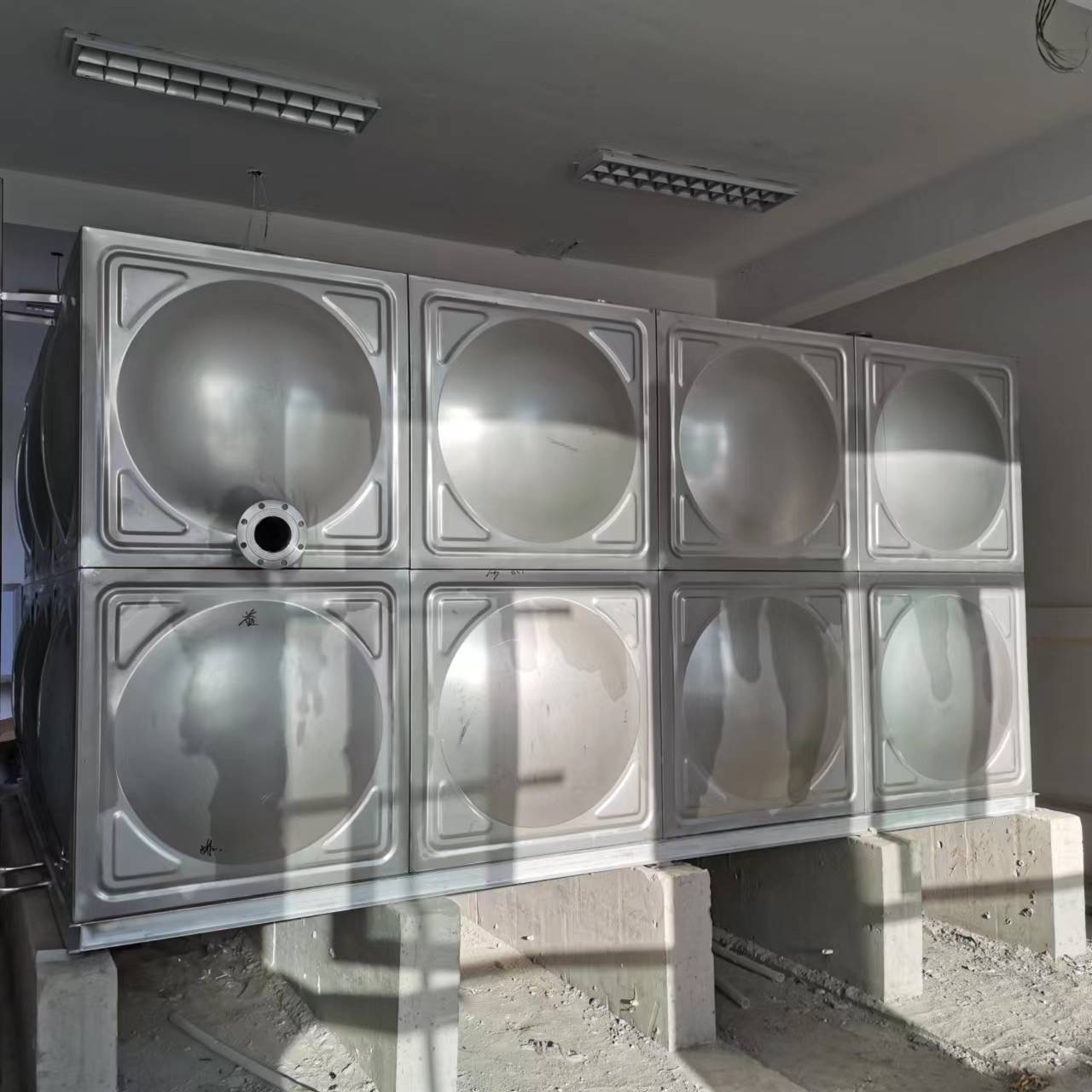 我司承接的河北省石家莊市長安區(qū)第九十三中學(xué),不銹鋼水箱項(xiàng)目已完工。不銹鋼水箱采用SUS304、SUS316L、SUS444等不銹鋼板,沖壓成型。一般沖壓成三種尺寸,分別是1x1米、1x0.5米和0.5x0.5米三種,周邊用鎢極氬弧焊接,具有強(qiáng)度高、重量輕、成本低、環(huán)保衛(wèi)生等特點(diǎn)。