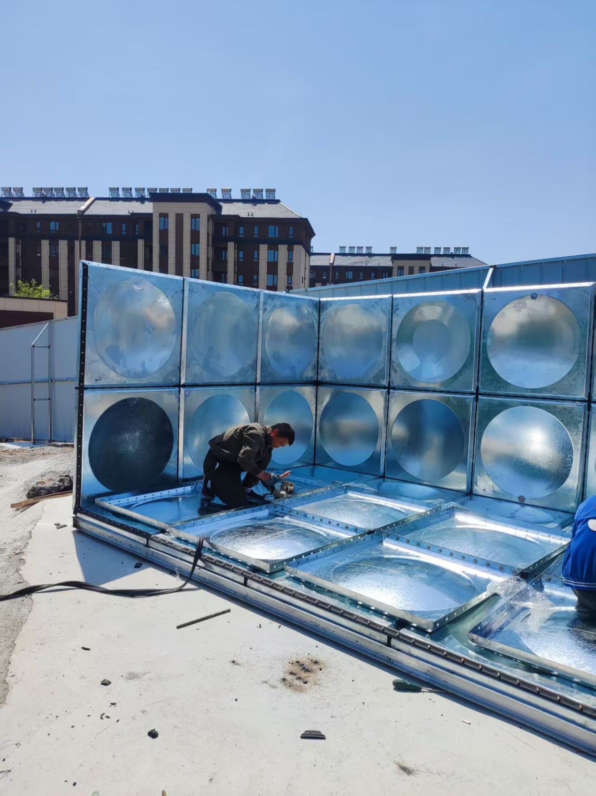 我司承接的山東省泰安市濟南中冶十二局臨時消防水箱項目,僅用一天的時間安裝試水完成。鍍鋅鋼板水箱具有重量輕、造價低、安裝簡單、用途廣等優點。